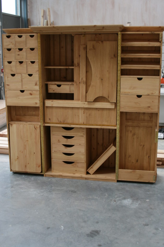 Above are images of a waxed version, showing how the unit folds when closed. This cupboard is also of interest because the main table and ironing table are reversed compared to the painted version, to suit a left handed person.